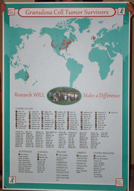 In 2014, GCT Survivor Sisters members contributed photos that were compiled into a large-format poster accompanied by a thoughtful cover letter explaining the purpose of the project and the urgent need for more research. With special thanks to Terri Nicken Colclough and Dianne Baughman, whose support was vital, the poster was sent to three major organizations—the Ovarian Cancer National Alliance, the National Ovarian Cancer Coalition, and the Ovarian Cancer Research Fund. Members received access to both the cover letter and a complete accounting of costs and funds, ensuring transparency. Out of respect for privacy, the poster itself was not posted on Facebook, though a photo of the organizer with the poster was shared privately and also provided to Powel Crosley for posting on the GCTFNZ website. This project demonstrated the community’s commitment to advocacy, its careful stewardship of sensitive materials, and its determination to capture the attention of national organizations in hopes of securing much-needed funding for GCT research.